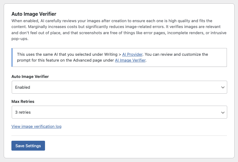 The verifier adds one extra AI call per image, using the same provider you’ve selected under Writing → AI Provider. Since it’s only checking a small, resized version of each image and expecting a one-word response, the cost per check is minimal, typically a fraction of a cent.
