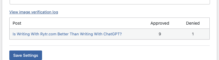 When the feature is enabled, a “View image verification log” link appears below the dropdown. Click it to expand a table showing each post that’s been through the verifier, along with how many images were approved and how many were denied.