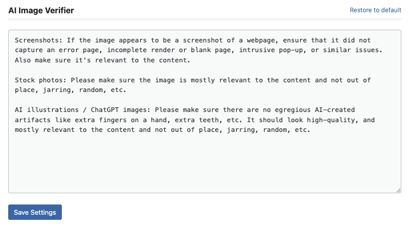 The default prompt instructs the AI to check screenshots for error pages and pop-ups, confirm stock photos are relevant and not out of place, and catch AI illustration artifacts like extra fingers or distorted features. You can make it stricter about relevance, more lenient about stock photos, or adjust it however you’d like.